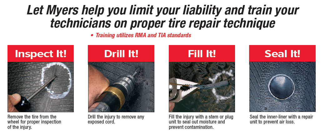 Using Do It Right® tire repair procedures, tools and materials can help protect your business from repair failures. Liabilities exist when technicians are not trained properly and when quality-patching materials are not used. Myers Tire Supply's Do It Right® classes train technicians on how to repair tires according to the Rubber Manufacturer Association’s standards. The Do It Right® training is offered on passenger and truck tires.